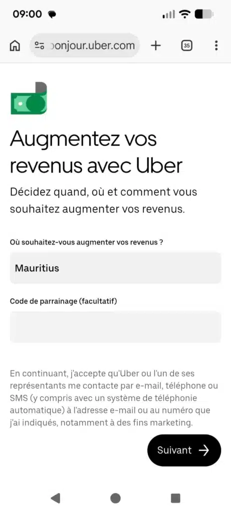 Vous pouvez maintenant choisir le pays où vous souhaitez devenir chauffeur Uber. Si vous êtes parrainé, vous pouvez entrer le code de parrainage à cette étape.